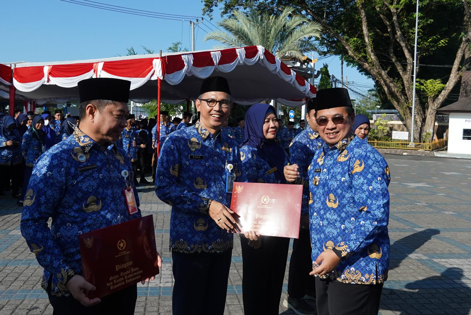 Penyerahan penghargaan tersebut diberikan di Apel KORPRI yang diikuti oleh seluruh Aparatur Sipil Negara (ASN) dijajaran Pemko Banjarmasin, di halaman Balai Kota Banjarmasin pada Rabu pagi, (17/07/2024).
